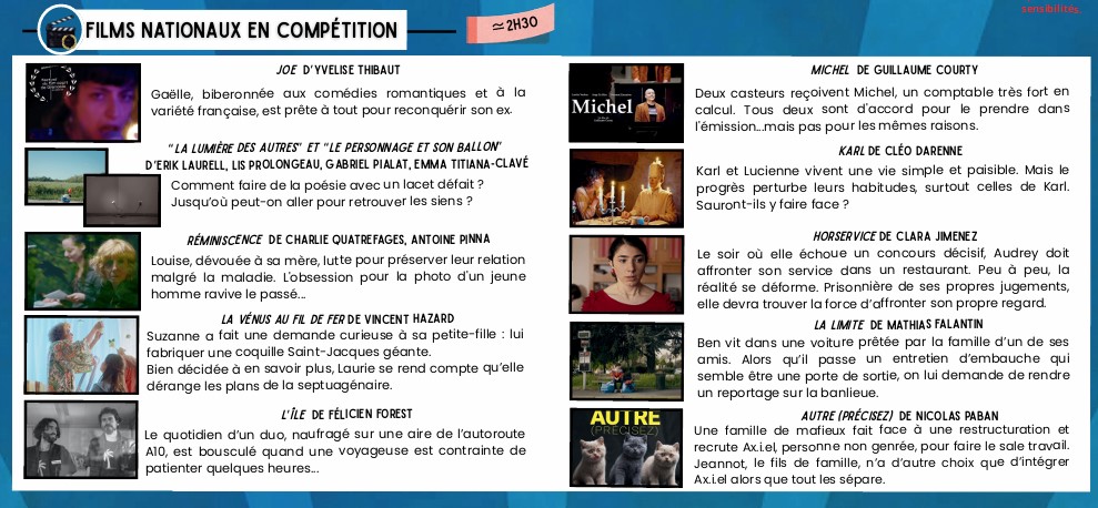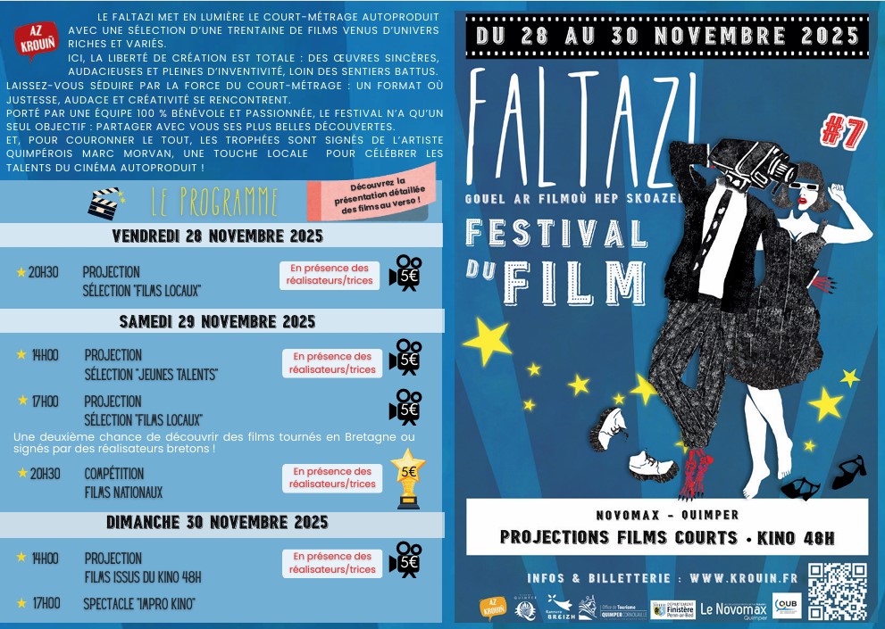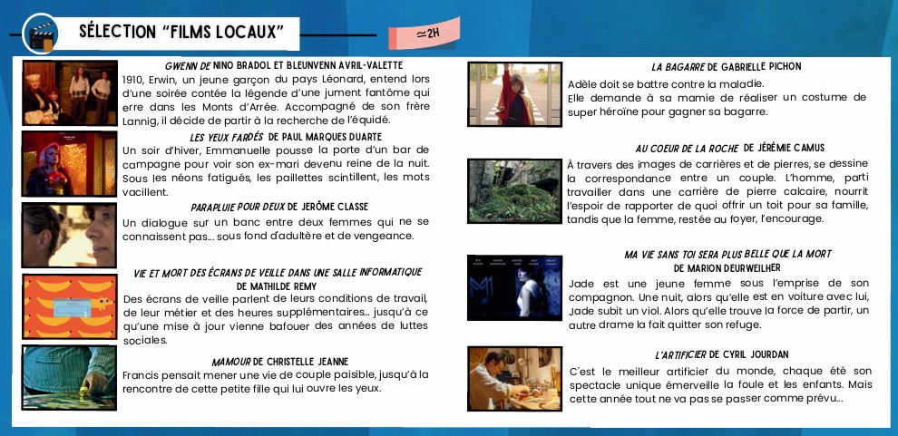 Une projection qui met à l’honneur les réalisations locales. Le comité sélectionne une dizaine de films tournés en Bretagne ou réalisés par un réalisateur breton. L’ensemble permet d’encourager les rencontres et les projets audiovisuels de la région. Films en français ou breton sous-titrés.