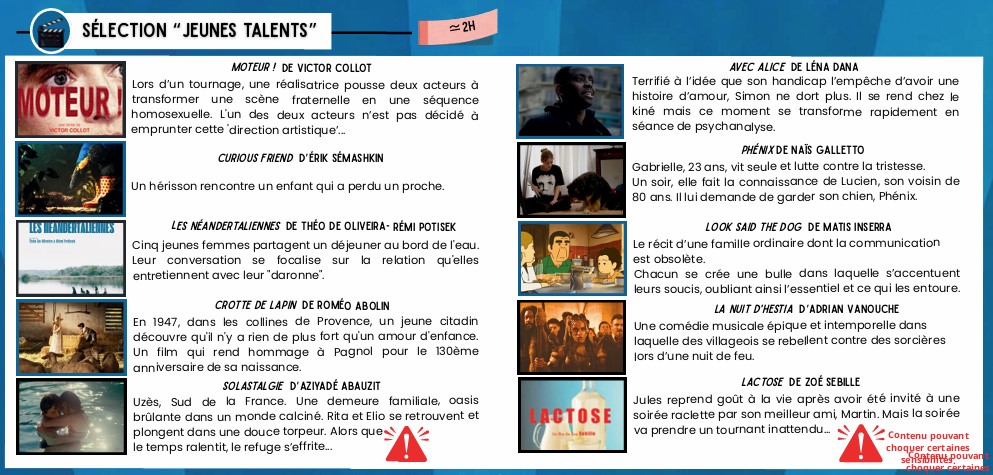 L’après-midi est consacrée aux jeunes réalisateurs. Une occasion certaine de découvrir des thématiques et des techniques modernes et novatrices pour le spectateur et chance de se faire connaître pour les réalisateurs en présentant un film autoproduit de qualité.