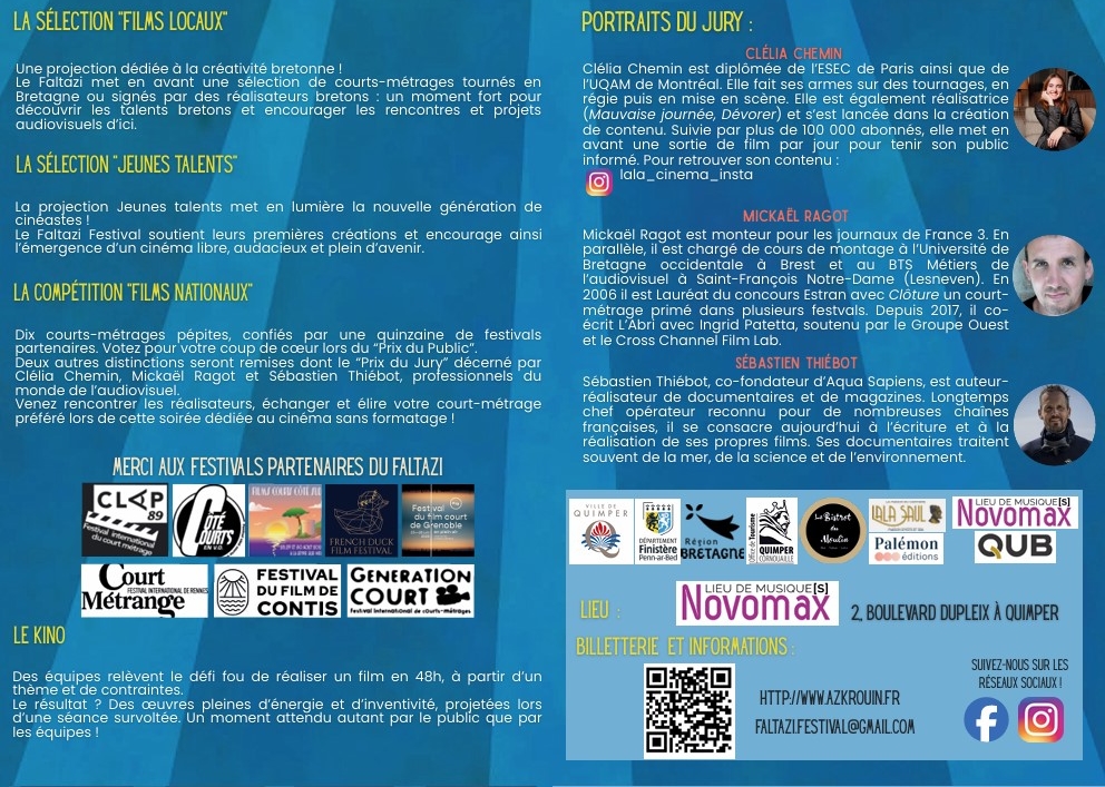 Une quinzaine de festivals nationaux partenaires nous transmettent leurs films primés, ce qui vous permet de découvrir à Quimper des films de grande qualité et autoproduits. L’objectif du Faltazi festival est de valoriser les autres festivals, de leur offrir une visibilité plus large en permettant à leurs lauréats de les représenter.